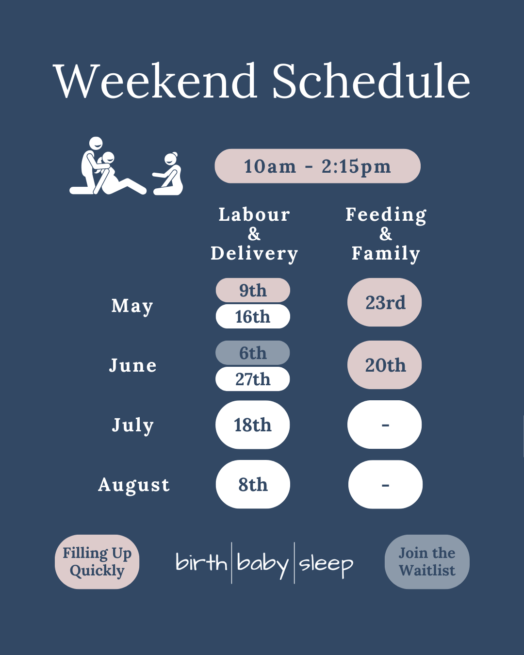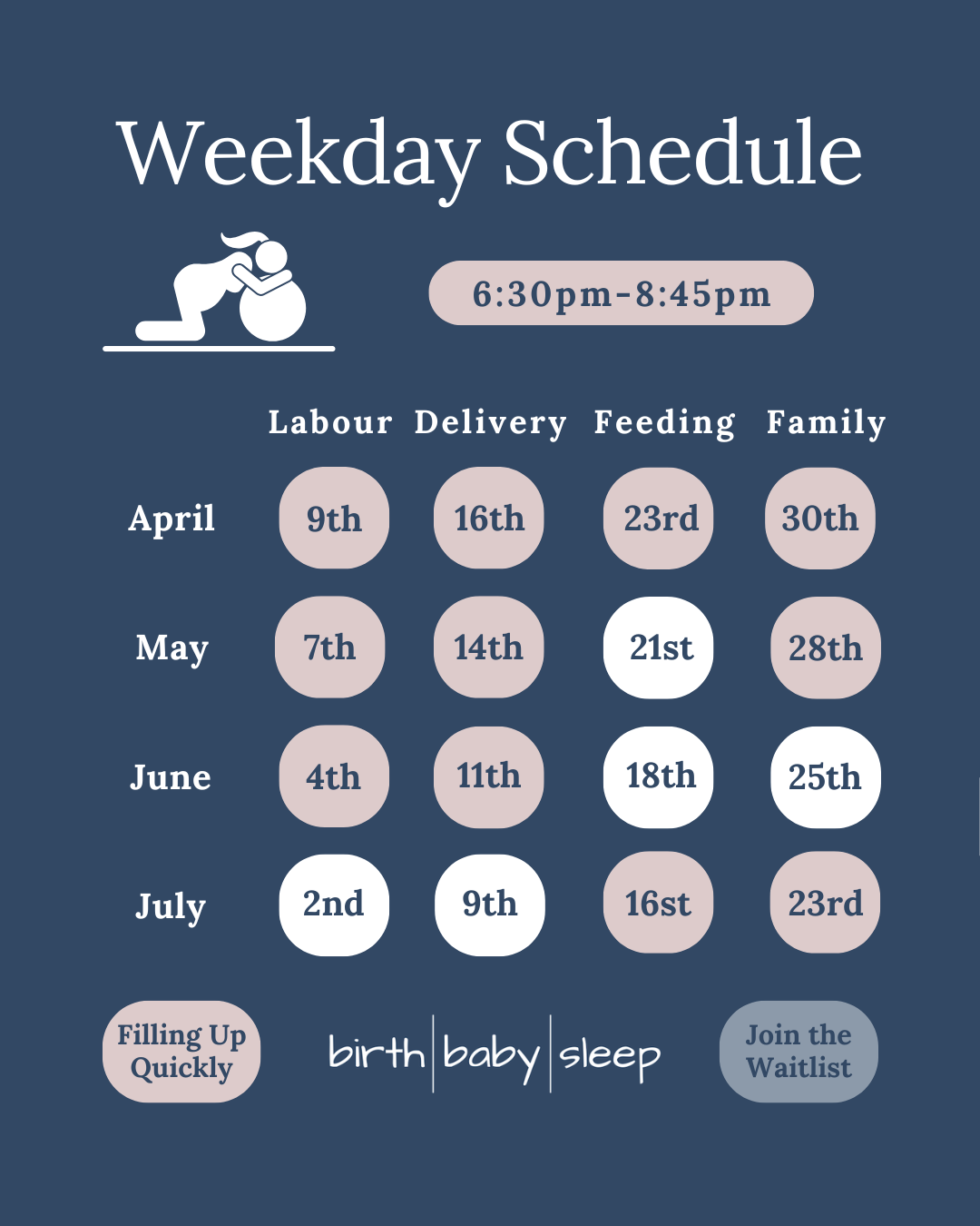 After this class, you and your partner/support person will have practical strategies to stay comfortable and help labour progress. You will also be well-informed of medical options.