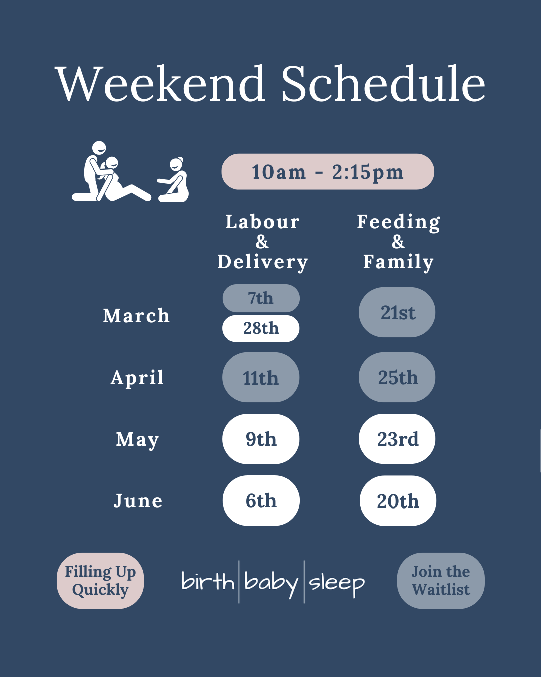 Classes run every month, all year long! See below for our upcoming schedule, class content and FAQs.