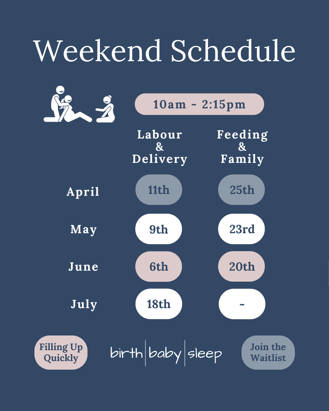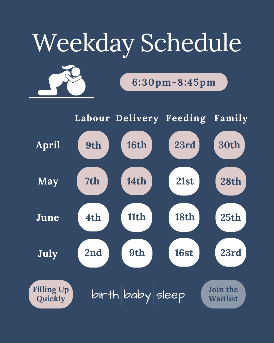 After this class, you and your partner/support person will have practical strategies to stay comfortable and help labour progress. You will also be well-informed of medical options.